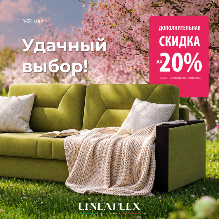 Весь май дополнительная скидка до 20% действует на мягкую мебель, кровати и матрасы!