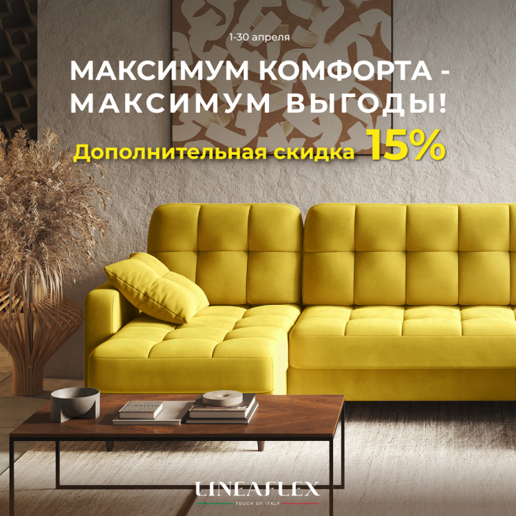 Весь апрель дополнительная скидка 15% действует на мягкую мебель, интерьерные кровати и матрасы!
