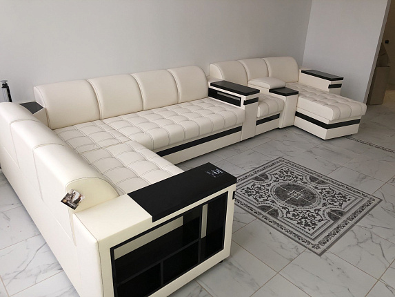 Диван "Ритис": экономия пространства! Обладая внушительными габаритами, "Ритис" успешно занимает свободное пространство, подлокотники оснащены дополнительными полками и нишами, встраимваемая розетка и поворотный столик создают атмосферу комфорта