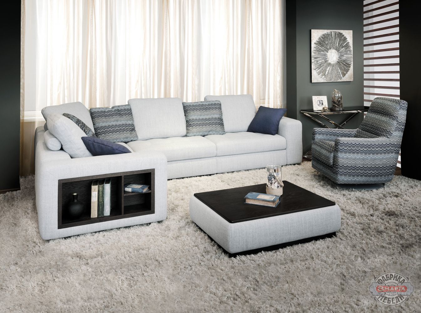 Модульная система «Стоун» подобна конструктору «Лего». «Стоун» никогда не надоест, его модули легко переставляются, полностью меняя форму модели. Благодаря способности менять конфигурацию Стоун приспособится к любому пространству. При желании можно ежедневно изменять внешний вид дивана в соответствии со своим настроением. Угловой диван может превратиться в комплект, состоящий из прямого дивана и уютного кресла. А шикарная П-образная композиция позволит создать интересную зону для отдыха с диванами и отдельными пуфами.
