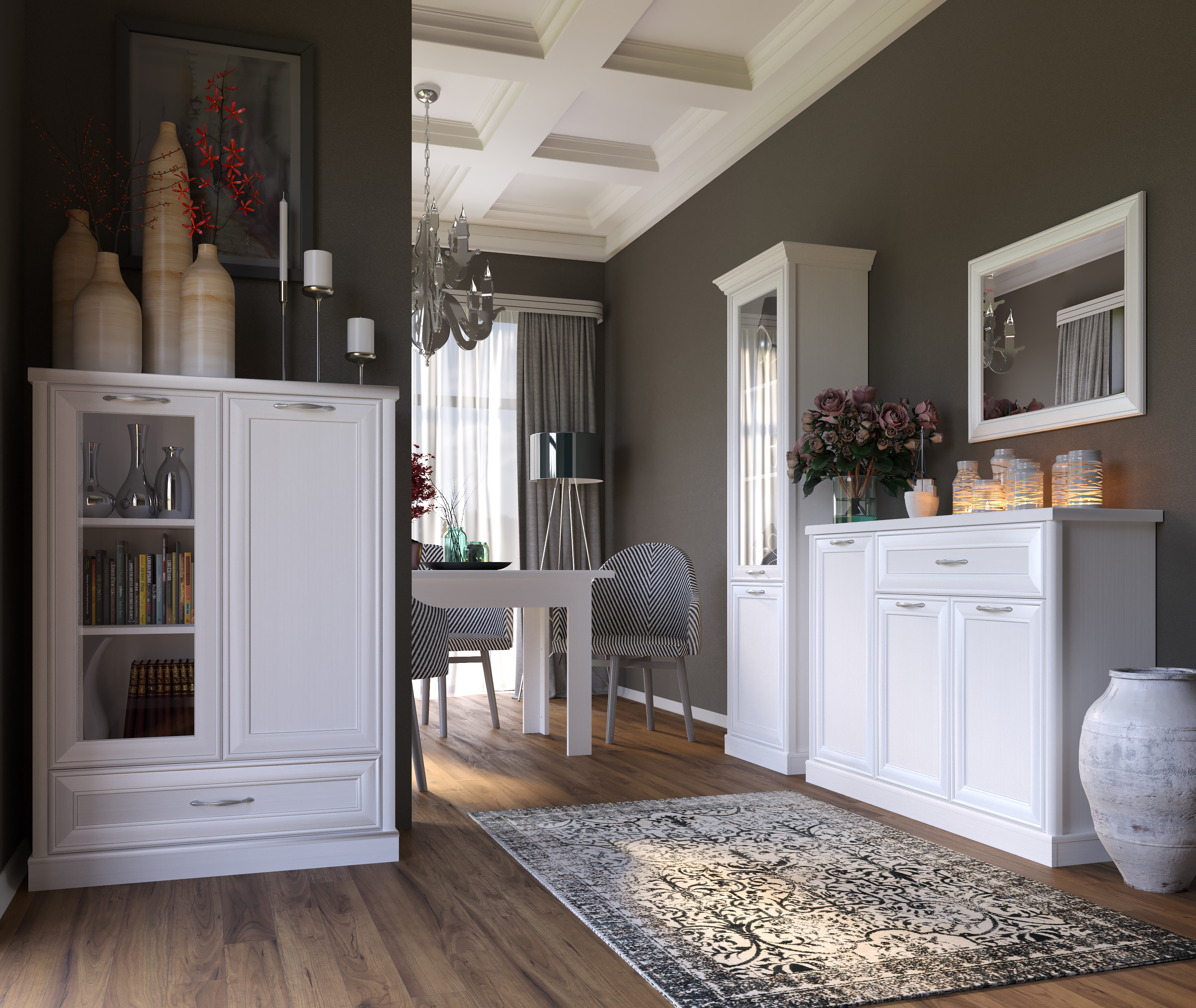 Коллекция TEYLOR вариация на тему классики.Патина на планках фасадов подчёркивает геометрию элементов мебели. Металлические ручки выполнены в классическом стиле.