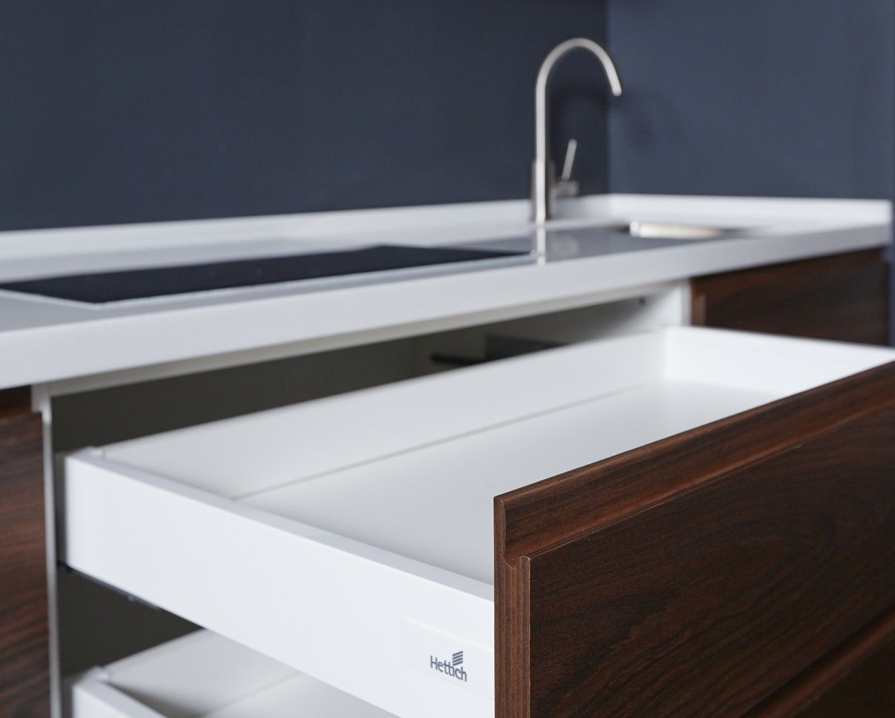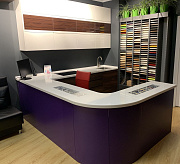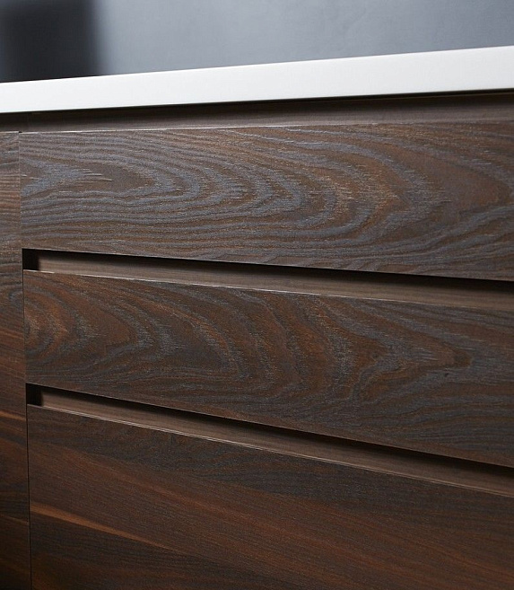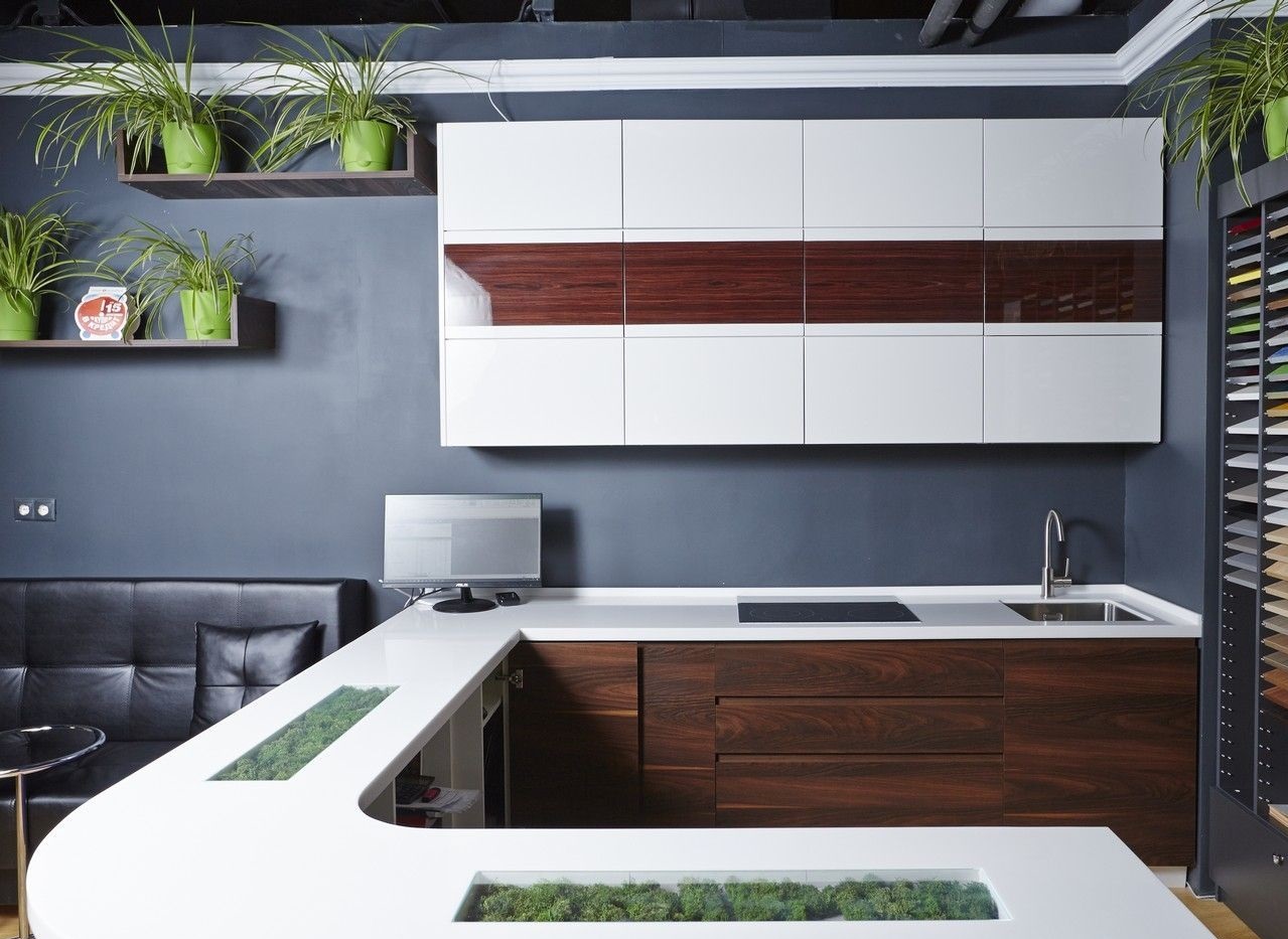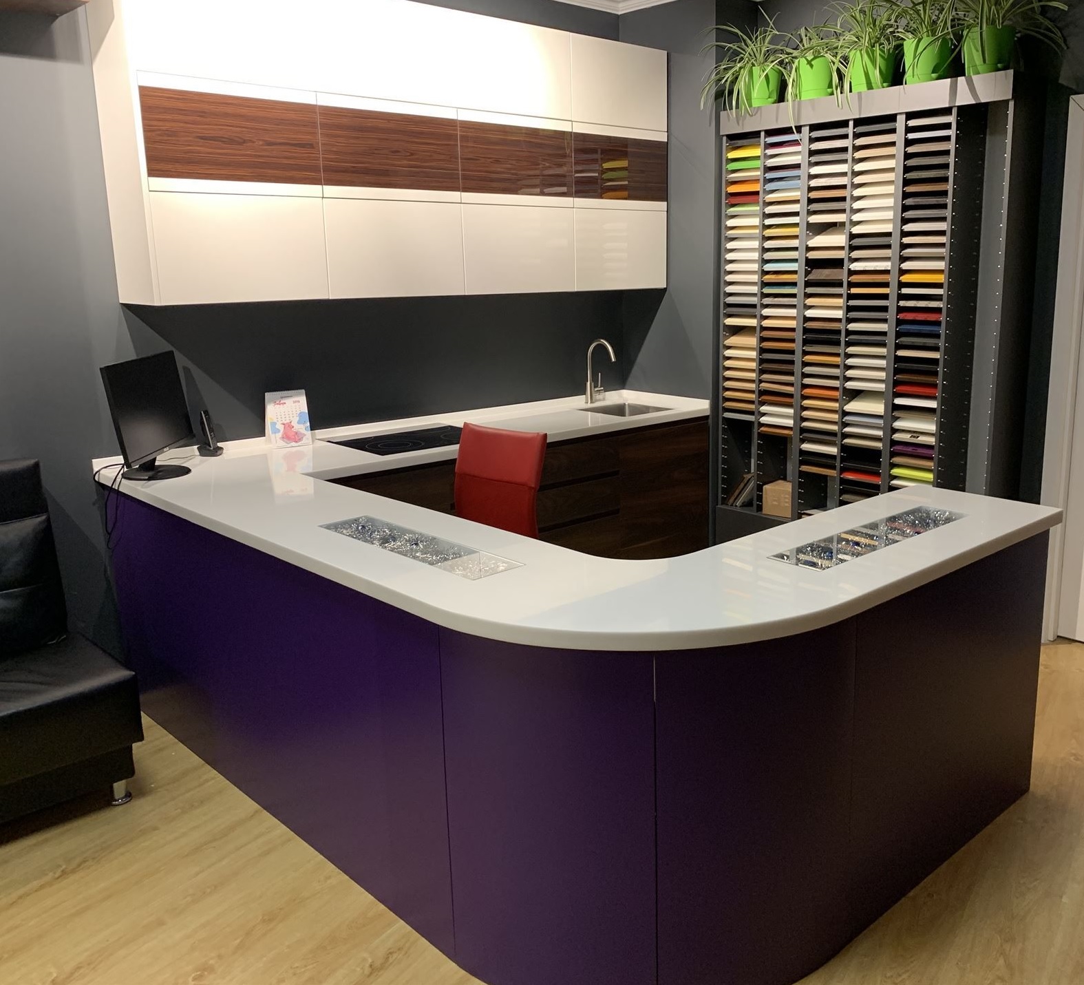 Материал: корпус: ДСП 18мм EGGER; фасады: МДФ 19 мм эмаль матовая, МДФ 19мм шпон глянец, плита 24мм пластик KLEAF; столешница- акрил с мойкой из нержавеющей стали .