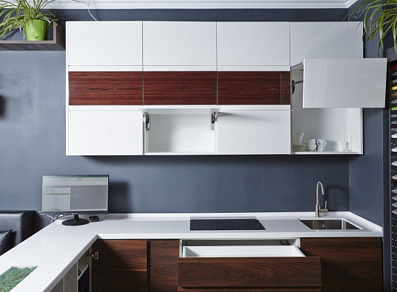 Фасады кухонь современного образца могут сочетать в себе различные материалы, фактуры, цвета. Визуально добавить объем в небольшом кухонном помещении можно за счет двух-, трехцветных фасадов. Часто это более темный низ и светлый контрастный верх.