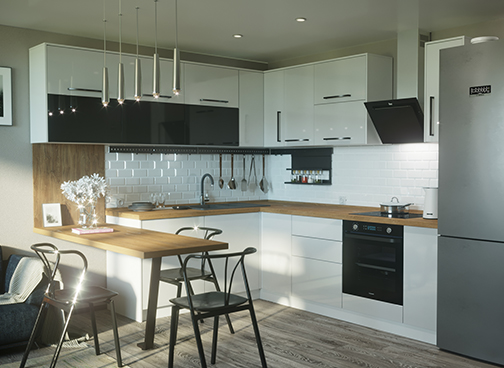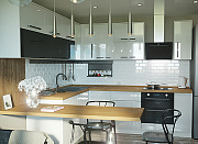 Очень стильное цветовое решение кухни — сочетание глянцевых белых и чёрных фасадов с матовой древесной столешницей. Нижние фасады открываются от нажатия. Верхний ряд разделён горизонтальными фасадами, что подчёркивает чёрный цвет. Они открываются с помощью механизмов HK-XS от Блюм. Большое преимущество использования таких подъёмников — фиксация положения фасада. Он никогда не «улетит» - Вы сможете спокойно достать/положить что-то и закрыть любой шкафчик, не подвергая спину дополнительной нагрузке. Все выкатные ящики — Avantech push-to-open (Hettich Германия). Современный вид гарнитура для кухни-гостиной дополняют встроенная духовка и варочная панель, а также наклонная вытяжка контрастного цвета. Вместо стола установлена барная стойка на современной металлической опоре. Рейлинг из чёрного металла также отлично вписывается в общий дизайн. Комплектация: Фасады: — МДФ в глянцевой плёнке, цвет «Белый OG» — МДФ в глянцевой плёнке, цвет «Чёрный OG» Столешница пластик, цвет «Дуб карпентер» Ручки-рейлинги, чёрные Рейлинг чёрный