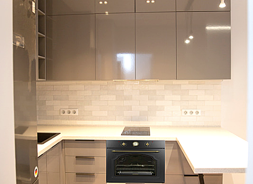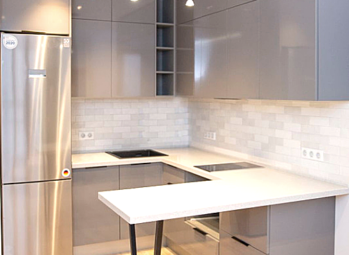 Фасады - ARPA 0595 Fin Lucida глянец (кромка с 4х сторон) Корпус - ЛДСП Еgger U732 ST9 серый пыльный Столешница - Staron PI811Pebble Ice Фурнитура - Blum Цоколь - 150 мм 0101 Алюминий
