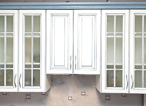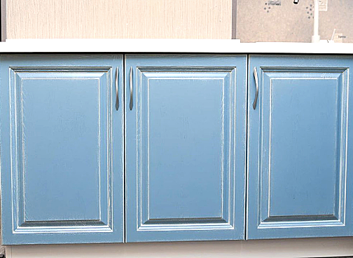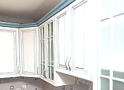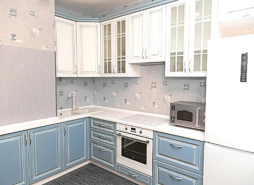 Фасады: Низ: массив дуба Classika KV Ral 5024(2 слоя) патина белая по контуру. Верх: массив дуба Classika KV белый (2 слоя) патина Ral 5024 по контуру. Цоколь платик Столешница - искусственный камень Grandex A-422. Корпус - ЛДСП Небесно-голубой и белый в кромке 2 мм. Петли с доводчиками, выдвижные механизмы с доводчиком — Blum. Лоток под столовые приборы Сушка угловая Италия 600х600 мм. Стекло сатинат белый. Карниз классика массив дуба. Ручки Сатин хром.
