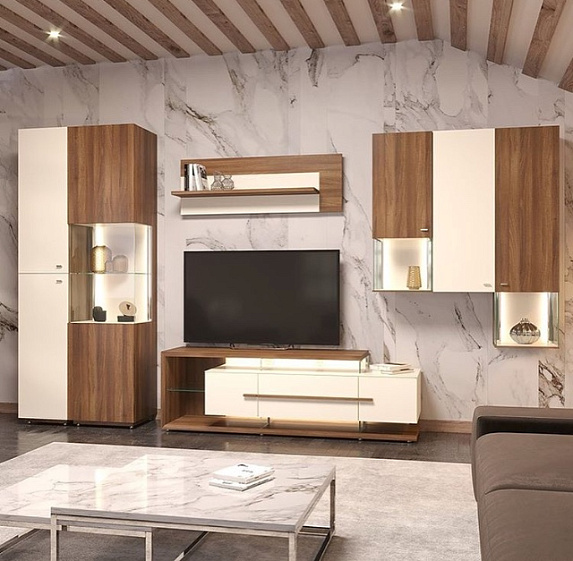 Эксклюзивная коллекция мебели для гостиной Rum & Cola создана из шпона древесины и тонированного стекла. Натуральный орех имеет приятный красновато-коричневый оттенок, узнаваемую текстуру с извилистым узором годовых колец. Благородный контраст черного стекла и древесины мягкого коричнево цвета способствует созданию в гостиной расслабляющей, уютной обстановки.