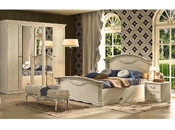 Спальня Лючия светлая выполнена в классическом стиле «Арте-Повери», с добавлением элементов стиля «Барокко». Это новая спальня с кроватью, в текстуре ясень декапе, украшенная резными профилями и бронзовыми ручками. Шкафную группу венчает широкий эффектный карниз и рамочный профиль с декоративным резным рисунком. Имеет широкий модульный ряд. Указана цена за стандартный набор: кровать двуспальная + шкаф трехдверный (2+1).