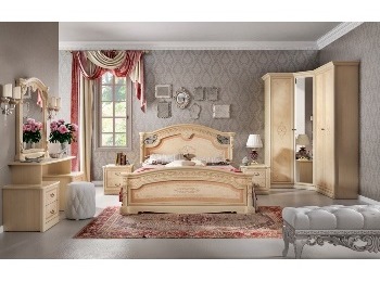 Спальня Эльба светлая выполнена в классическом стиле, имеет широкий модульный ряд. Особенности: -Топ на комодах и тумбах МДФ с фигурной фрезеровкой -Карнизы, пилястры, фигурные цоколи, декоративные профили на шкафной группе, комодах и тумбах с патинированием -Ручки металлические, покрытие «античная бронза» -Изголовье кровати украшено богатым багетом (ППУ) с декоративными вставками из металла, цвет «античная бронза» -Шкафная группа в спальне стандартная, есть прямые, угловые шкафы с зеркалом и без. В каждом отделении 2 полки и штанга, 3 полки – дополнительная опция -Кровати дополнительно комплектуются ящиками для белья Указана цена за стандартный набор: кровать двуспальная + шкаф трехдверный (2+1).