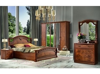 Спальня Эльба темная выполнена в классическом стиле, имеет широкий модульный ряд. Особенности: -Топ на комодах и тумбах МДФ с фигурной фрезеровкой -Карнизы, пилястры, фигурные цоколи, декоративные профили на шкафной группе, комодах и тумбах с патинированием -Ручки металлические, покрытие «античная бронза» -Изголовье кровати украшено богатым багетом (ППУ) с декоративными вставками из металла, цвет «античная бронза» -Шкафная группа в спальне стандартная, есть прямые, угловые шкафы с зеркалом и без. В каждом отделении 2 полки и штанга, 3 полки – дополнительная опция -Кровати дополнительно комплектуются ящиками для белья Указана цена за стандартный набор: кровать двуспальная + шкаф трехдверный (2+1).
