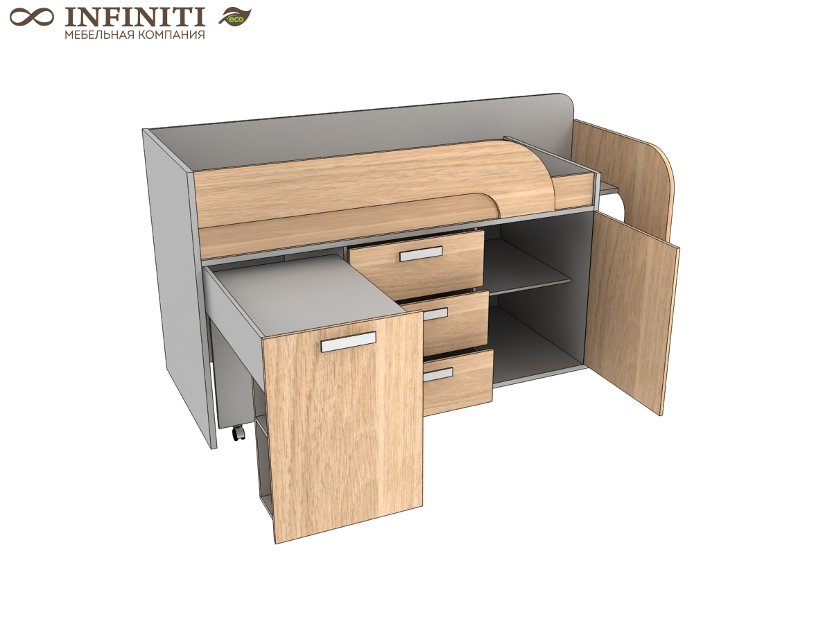 Практичная и многофункциональная кровать-чердак с встроенными шкафами и лестнице с ящиками поможет разместить большое количество вещей на минимальной площади. Спальное место 80 см по ширине и 160 см по длине комплектуется Gerbera New 80*160, Fresia New 80*160, Azalea New 80*160, Rose New 80*160. В изготовлении коллекции SMART применяется безопасный материал – Эко плита с добавлением природной крошки Шунгит. Эко плита используется с прочным покрытием, которое позволяет на нем даже рисовать, мебель всегда будет выглядеть, как новая! Ручки для кровати можно выбрать из десяти вариантов, они приобретаются также отдельно. Вся коллекция SMART оснащена фурнитурой ведущего австрийского производителя BLUM, что обеспечивает безопасное пользование мебели даже самым маленьким членам семьи. Фурнитура, при закрытии фасада, предотвращает хлопок, плавно доводит его. Купить кровать можно разными удобными способами: оформить покупку в интернет- магазине, положив товар в корзину, или посетить фирменный салон, так же можно выбрать удобный способ оплаты. *Скидка на кровать действует только при условии покупки матраса от Infiniti мебель.