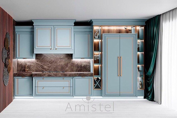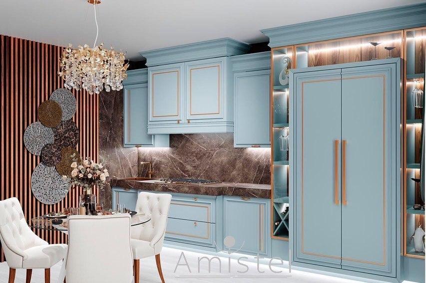 Небесно-голубые фасады, золотые акценты, мраморная столешница и декор в дизайнерском шпоне - роскошная кухня для ценителей.