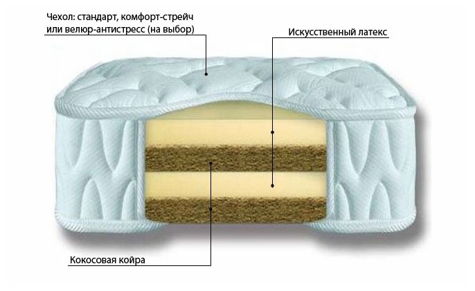 Жесткий матрас Matramax Экосэндвич 16. Состав: искусственный латекс – 3 см (2 слоя), кокосовая койра – 3 см (2 слоя). Чехол: ткань Comfort Streeetch (хлопок) или Matramax Antistress (велюровая ткань с антистатическим покрытием) на выбор, простеганный на холлофайбере. Беспружинный на основе искусственного латекса и кокоса
