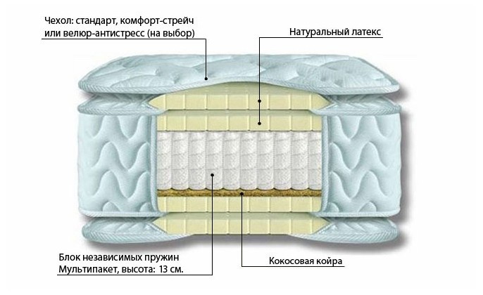 Ортопедический матрас класса премиум Matramax Президент М-13, имеющий две степени жесткости (одна из сторон чуть жестче другой). Состав: блок независимых пружин мультипокет М-13/4 (500 пружин на 1 кв.м., высота пружин 13 см.), натуральный латекс 3 см. с обеих сторон и с одной стороны матраса латекс 3 см. во вшитом наматраснике (технология PillowTop), кокосовая койра - 1 см. с другой стороны. Чехол: ткань Comfort Streeetch (хлопок) или Matramax Antistress (велюровая ткань с антистатическим покрытием) на выбор. Простеган на холлофайбере.