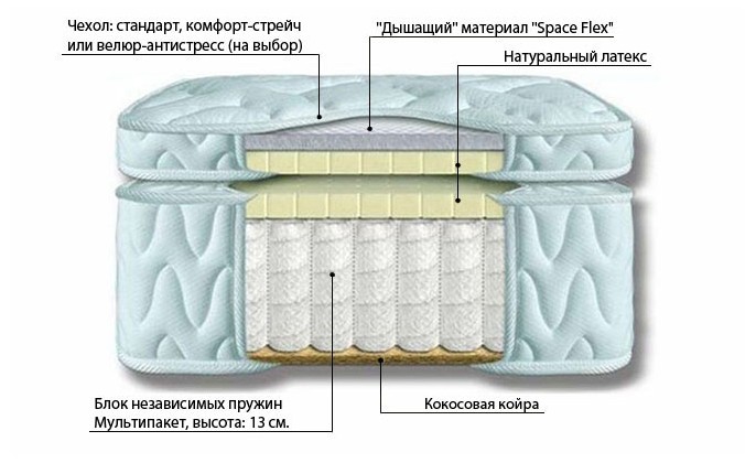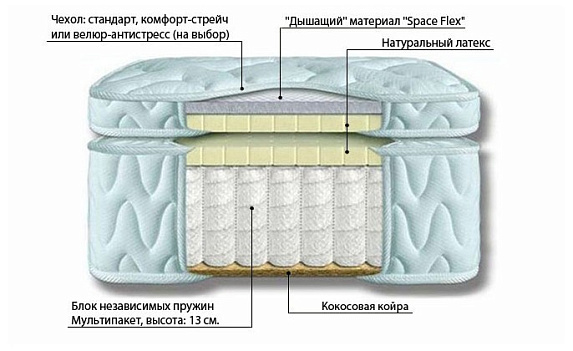 Мягкий ортопедический матрас класса премиум Matramax Струммер М-13. Состав: блок независимых пружин мультипокет М-13/4 (500 пружин на 1 кв.м., высота пружин 13 см.), верхний слой - натуральный латекс - 3 см. и "дышащий" материал "Space Flex" 3 см. во вшитом наматраснике (технология PillowTop), нижний слой - кокосовая койра - 1 см. Чехол: ткань Comfort Streeetch (хлопок) или Matramax Antistress (велюровая ткань с антистатическим покрытием) на выбор. Простеган на холлофайбере. Высокоэластичная пена, Латекс, Кокос/ Чехол Comfort Streeetch (хлопок) или Matramax Antistress (велюровая ткань с антистатическим покрытием).