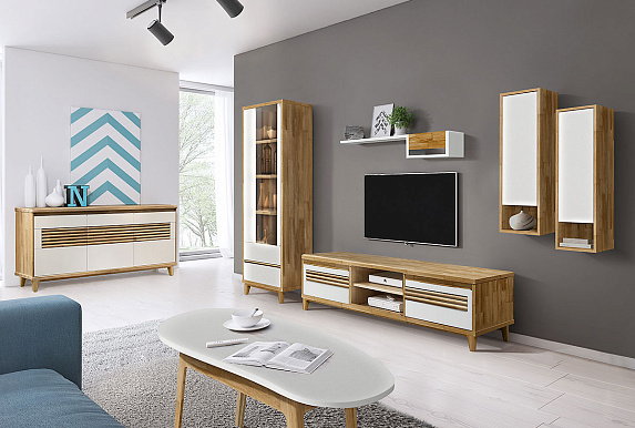 Гостиная Wallstreet #2. Текстура натурального дерева и акцентные белые вставки мебели для гостиной в стиле Лофт. Тумба под ТВ навесные шкафы, витрина и журнальный стол