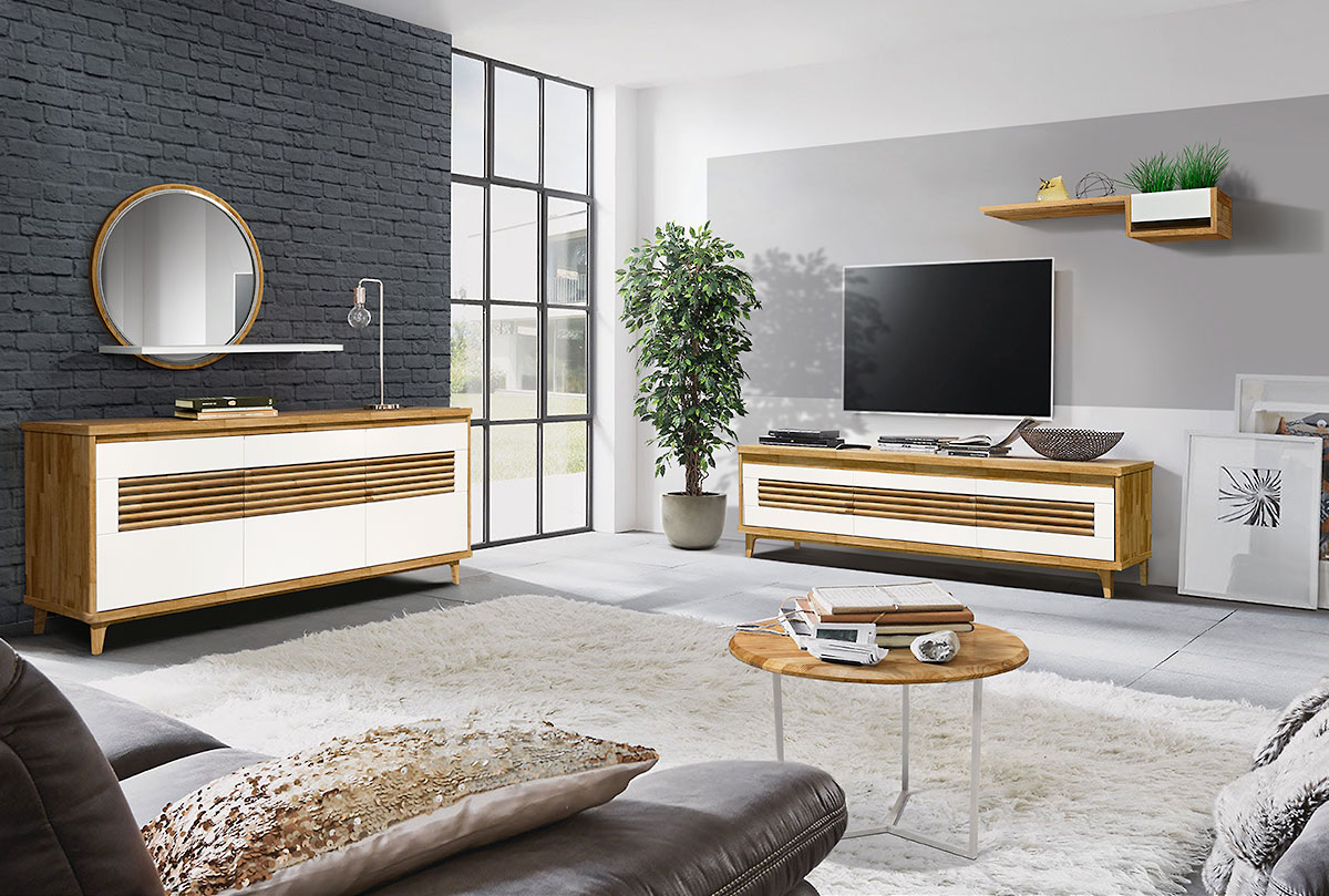 Гостиная Wallstreet, интерьер #1 укомплектован тумбами из натурального дерева и акцентных белых вставок, а так же круглым зеркалом с полкой. Дополняет интерьер настенная полочка.
