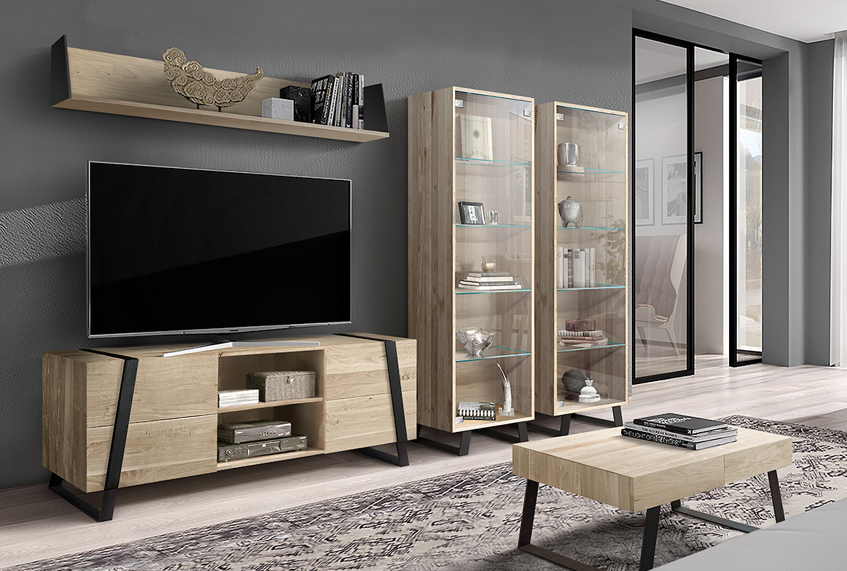 Гостиная Dillinger #8 - оригинальная мебель для гостиной в стиле Лофт, в "цвете белый дуб". Тумба под ТВ, Витрины однодверные, полка настенная.