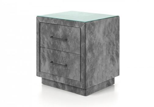 Прикроватная тумба с двумя выдвижными ящиками сочетается с любыми моделями кроватей, органично вписывается в интерьер практически любого стиля. Каркас тумбы выполнен из ДСП. Каркас тумбы и фасад ящиков покрыты обивочным материалом. Для удобства использования и продления срока эксплуатации, рекомендуется использовать стеклянную накладку. Накладка используется в качестве столешницы для тумбы и защищает ее от повреждений и загрязнений