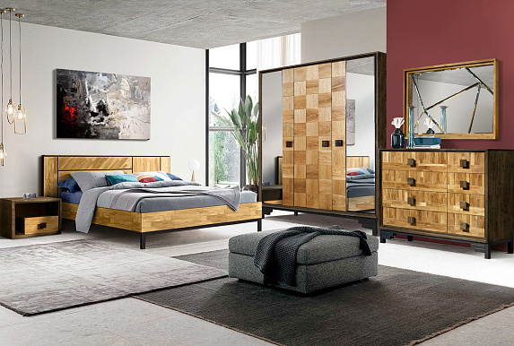Спальня Cube Design #2 стиле Лофт – кровать двуспальная, прикроватные, 3-х дверный шкаф для одежды, комод с зеркалом.