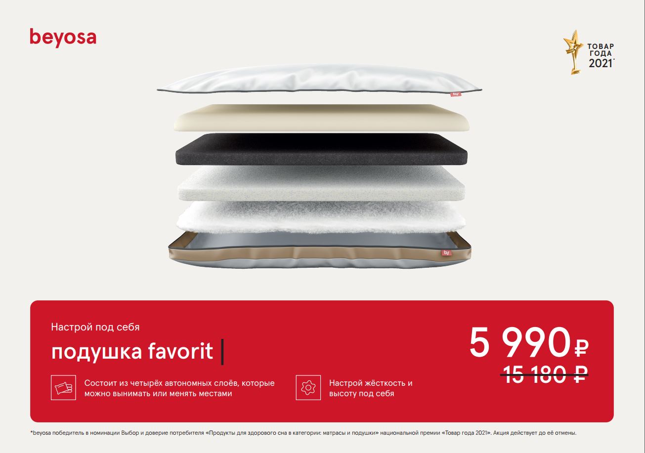 Подушка favorit Состоит из четырёх автономных слоёв, которые можно вынимать или менять местами, настрой жёсткость и высоту под себя!