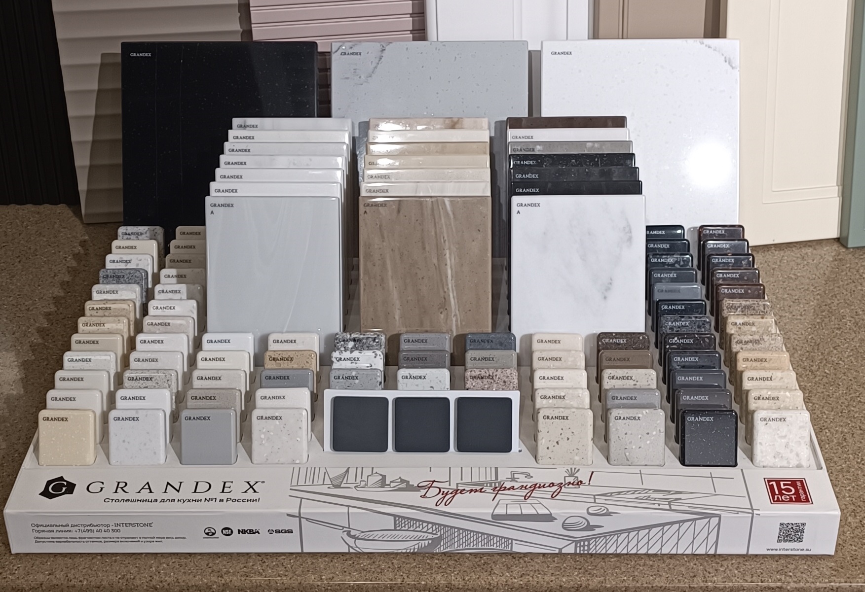 Grandex – акриловый композит, который пользуется особой популярностью у дизайнеров и архитекторов. Благодаря всевозможным цветовым решениям и пластичности материала появляется возможность воплощать творческие идеи при создании предметов интерьера. Изделия, для производства которых использован искусственный камень Grandex, ремонтопригодны и легки в эксплуатации. В течение многих лет акриловый камень Grandex не теряет презентабельного внешнего вида, а срок гарантии на этот материал составляет 15 лет. В связи с отсутствием в составе этого материала вредных веществ этот искусственный камень можно применять в контакте с едой. Основу этого камня составляют акриловые смолы.