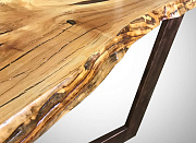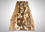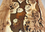 Стол из ивы с полупрозрачной оранжевой эпоксидной смолой на металлическом подстолье цвета «бронза» с диким краем. Текстура дерева и сочетание удивительных рисунков дерева утопленных в смолу, создает объем и глубину. Финишное покрытие выполнено лаком. Возможно изготовление на заказ по индивидуальным размерам.