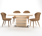 Комплект состоит из стола и 4 стульев. Описание стола: Оригинальный стол для кухни. Комбинированная столешница из МДФ и закаленного глянцевого стекла не боится влаги и не впитывает загрязнения. База стола - МДФ + металл блестящего стального цвета. Стол легко раскладывается, вставка "бабочка" хранится под столешницей. Материал каркаса: МДФ окрашенный. Материал столешницы: МДФ\Стекло закаленное. Габариты стола: 140х80 см, высота 76 см. Габариты столешницы в разложенном виде: 160х80 см. Стол упакован в 3 упаковки. Описание стульев: Ножки стула выполнены из металла. В данной модели ножки стула обтянуты к кожзам. Сиденье стула выполнено из гнутоклеевой фанеры + ППУ, обивка кожзам на х/б основе. Кожзам характеризуется отличными качествами в бытовом использовании - не вытирается, несложные загрязнения легко удалить с помощью влажной губки, не боится моющих средств, не выгорает со временем. Габариты стула: 44х43 см, высота 87 см. Максимальная нагрузка на стул не более 120 кг. Гарантия 12 месяцев.