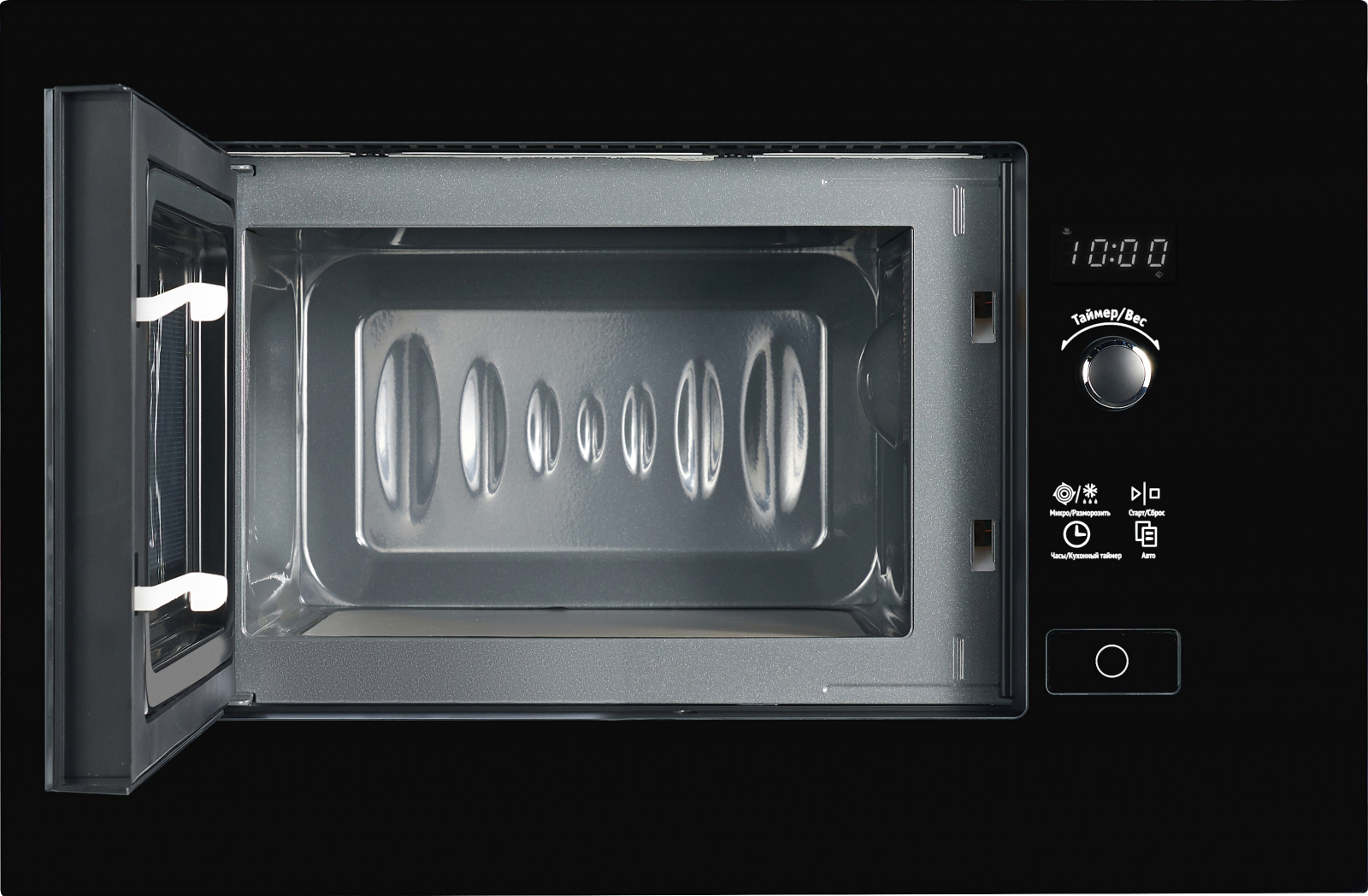 Встраиваемая микроволновая печь Weissgauff в чёрном цвете равномерно разогревает еду без поворотного стола, благодаря системе Spiegel и биокерамическому покрытию White Flat Ceramic.