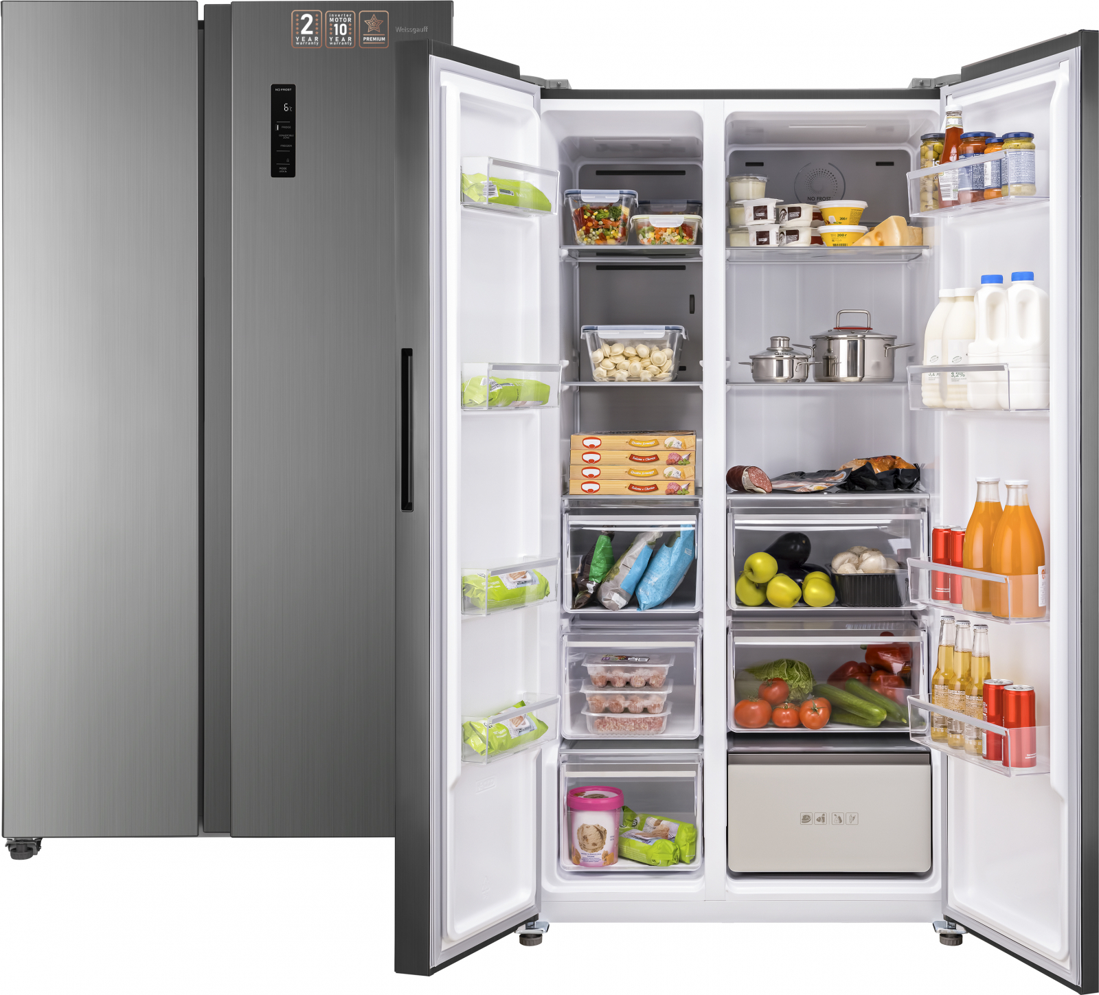 Отдельностоящий холодильник Weissgauff, выполненный в современном европейском дизайне Side-by-Side в цвете "нержавеющая сталь", обладающий конвертируемой зоной, полной системой размораживания Full No Frost и полностью электронным управлением - это соотношение фантастической вместительности, безупречной эргономики внутреннего пространства, технологического совершенства и великолепного дизайна!