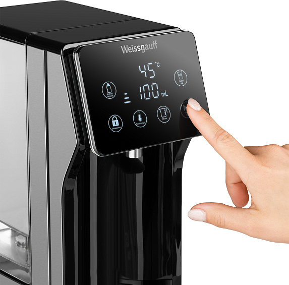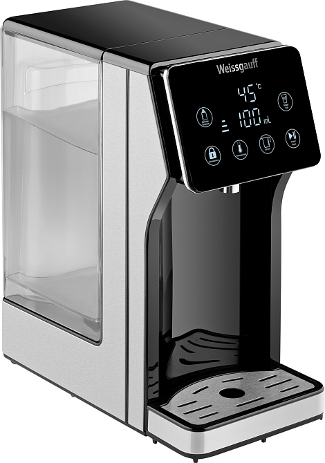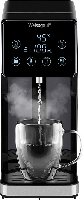 Вместительный и функциональный термопот от Weissgauff, оснащенный проточным нагревателем, позволяющим получить горячую воду буквально за 5 секунд, выполненный в чёрном цвете, обладает съемным баком для воды объемом 3 литра, возможностью поддержания требуемой температуры в диапазоне от 40 до 100 °C, а также 7 уровнями регулировки нагрева и двумя быстрыми функциями "Детское питание" и "Кофе/Чай".
