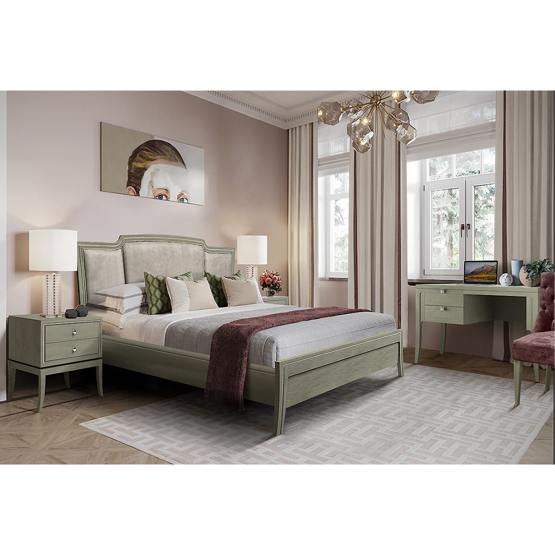 Детская Costa #1 в крашении «оливия + белая патина». Кровать с мягким изголовьем, прикроватные тумбы и письменный стол из натурального дуба.