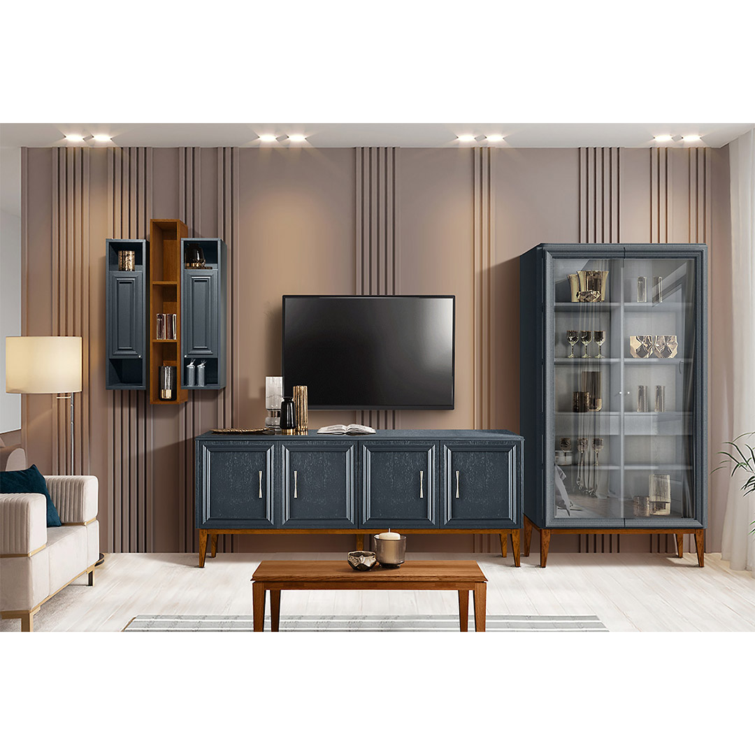 Гостиная «Сакраменто» (вариант 7). Витрина 2х дверная, тумба с 4ящиками, стол журнальный, шкафы настенные и стеллаж настенный в цвете сумеречный, орех.